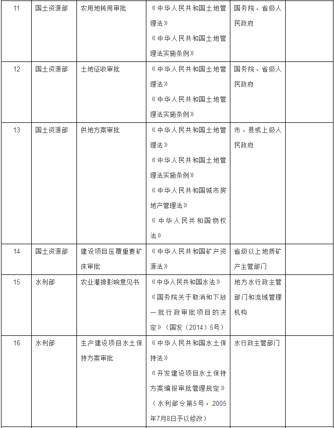 国土资源部门4项:农用地转用审批、土地征收审批、供地方案审批、建设项目压覆重要矿床审批。