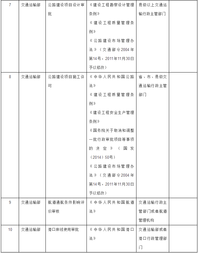 交通运输部门5项:水运工程设计文件审查、公路建设项目设计审批、公路建设项目施工许可、航道通航条件影响评价审核、港口岸线使用审批。