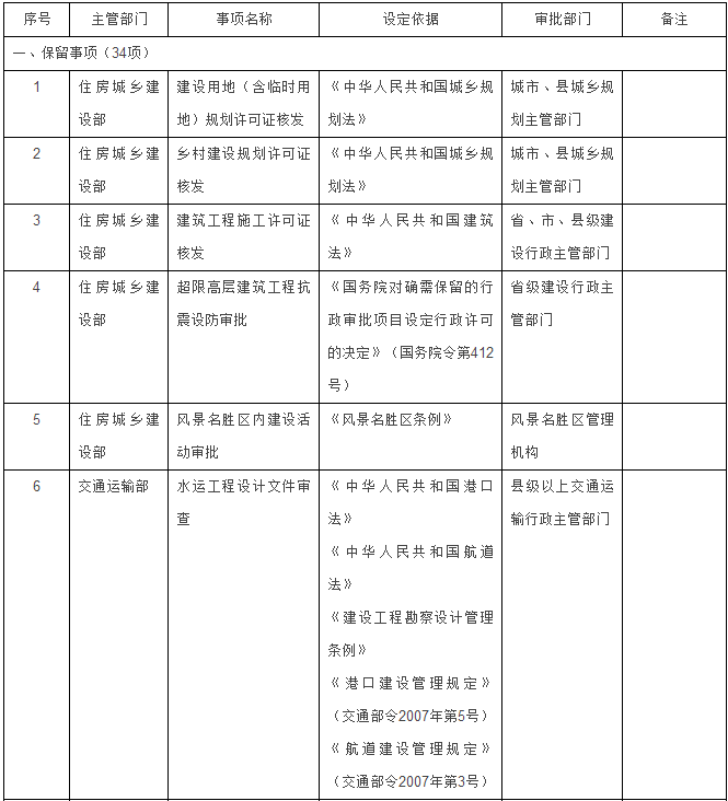 住房城乡建设部门5项:建设用地(含临时用地)规划许可证核发、乡村建设规划许可证核发、建筑工程施工许可证核发、超限高层建筑工程抗震设防审批、风景名胜区内建设活动审批。