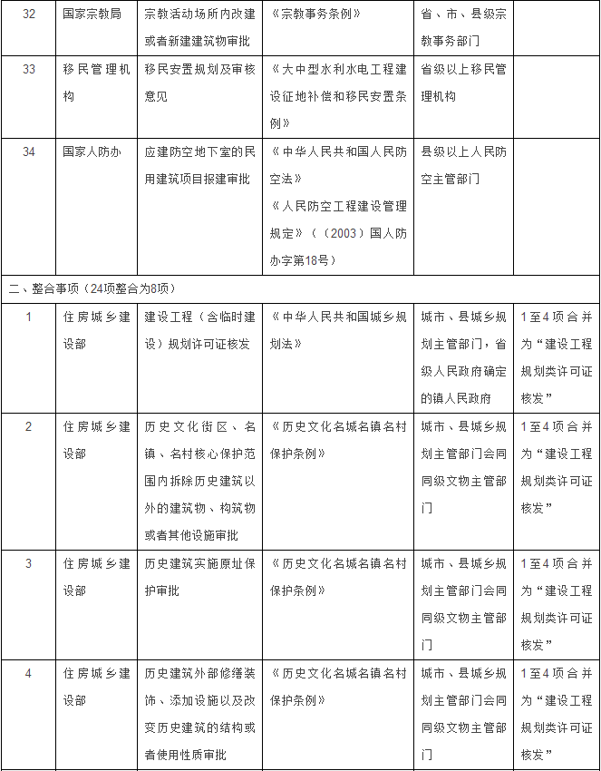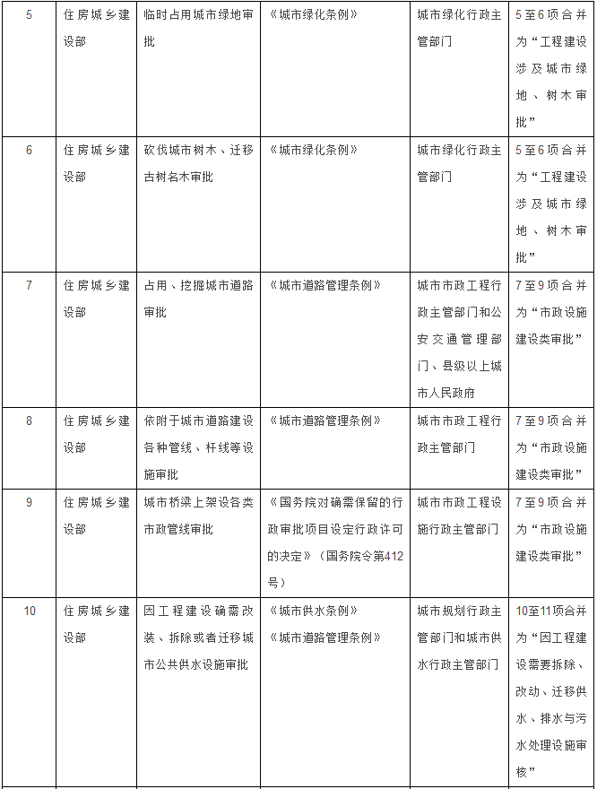 住房城乡建设部门11项整合为4项:一是将“建设工程(含临时建设)规划许可证核发”、“历史文化街区、名镇、名村核心保护范围内拆除历史建筑以外的建筑物、构筑物或者其他设施审批”、“历史建筑实施原址保护审批”、“历史建筑外部修缮装饰、添加设施以及改变历史建筑的结构或者使用性质审批”4项,合并为“建设工程规划类许可证核发”1项;二是将“临时占用城市绿地审批”、“砍伐城市树木、迁移古树名木审批”2项,合并为“工程建设涉及城市绿地、树木审批”1项;三是将“占用、挖掘城市道路审批”、“依附于城市道路建设各种管线、杆线等设施审批”、“城市桥梁上架设各类市政管线审批”3项,合并为“市政设施建设类审批”1项;四是将“因工程建设确需改装、拆除或者迁移城市公共供水设施审批”、“拆除、移动城镇排水与污水处理设施方案审核”2项,合并为“因工程建设需要拆除、改动、迁移供水、排水与污水处理设施审核”1项。