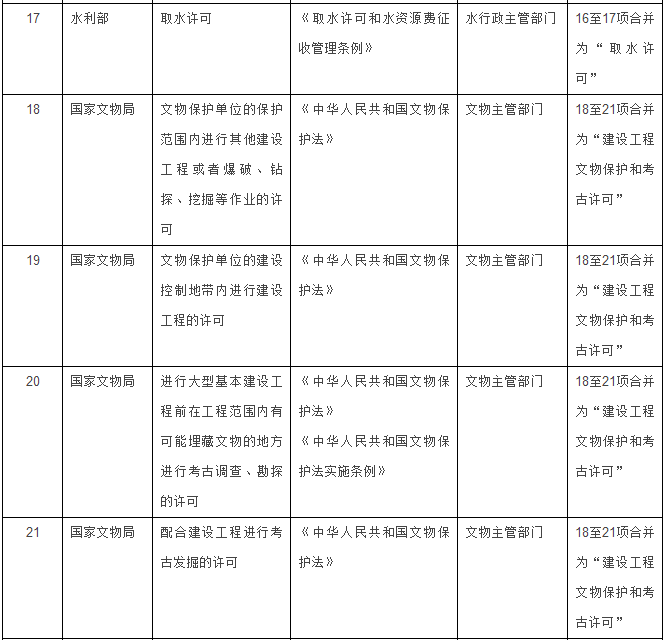 文物部门4项整合为1项:将“文物保护单位的保护范围内进行其他建设工程或者爆破、钻探、挖掘等作业的许可”、“文物保护单位的建设控制地带内进行建设工程的许可”、“进行大型基本建设工程前在工程范围内有可能埋藏文物的地方进行考古调查、勘探的许可”、“配合建设工程进行考古发掘的许可”4项,合并为“建设工程文物保护和考古许可”1项。