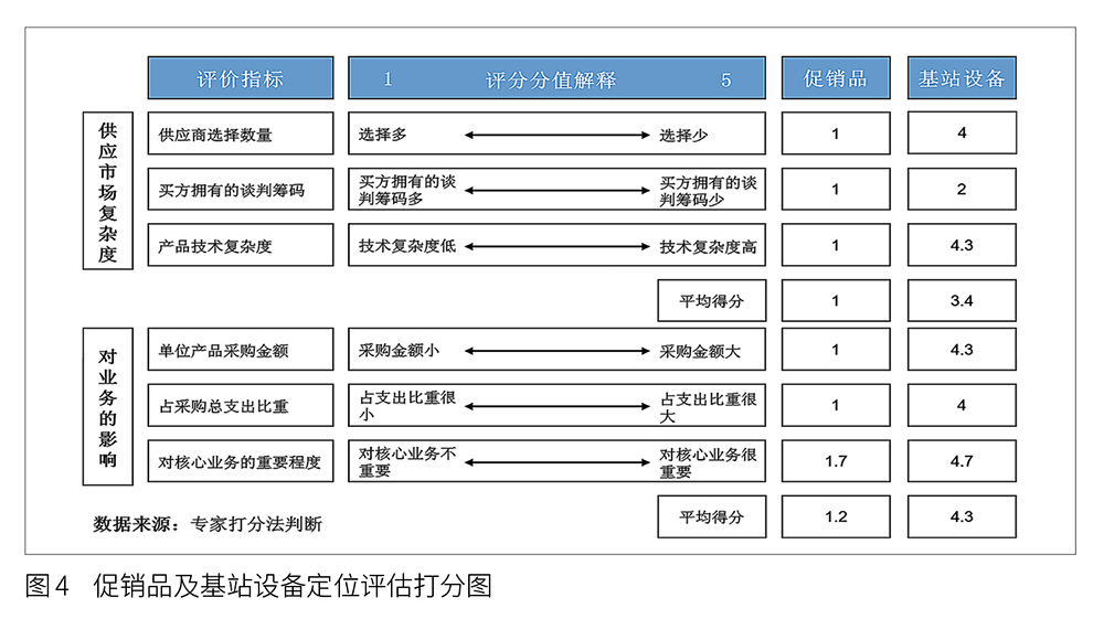 构建评估打分表,从上述两个维度量化供应市场复杂度和业务影响度。以促销品和基站设备为例,分析市场复杂度和对业务影响度,评价结果如图4所示。