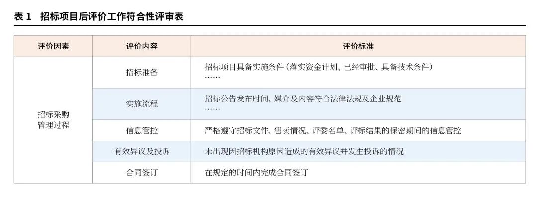 由后评价专家组研究制定适合不同类型项目的评价指标模版,除通用的“符合性和完整性检查”之外,还应建立覆盖全面的指标池:包括对评价条款、招标效率、流程复盘、经济效益考核等“质量性评审”指标,实现合规检查与质量提升相结合。在实施操作过程中,一方面结合项目类型选择不同的评价模版,另一方面可以重点聚焦当前工作中存在的突出问题,动态调整重点关注的指标,确保后评价的实效性。